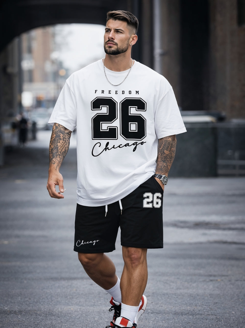 The Freedom 26 Chicago Co-Ord Set by Axe And Power represents bold street attitude blended with everyday athletic comfort. Inspired by classic city culture, this set features a strong front graphic paired with a clean black-and-white contrast for a timeless urban look.